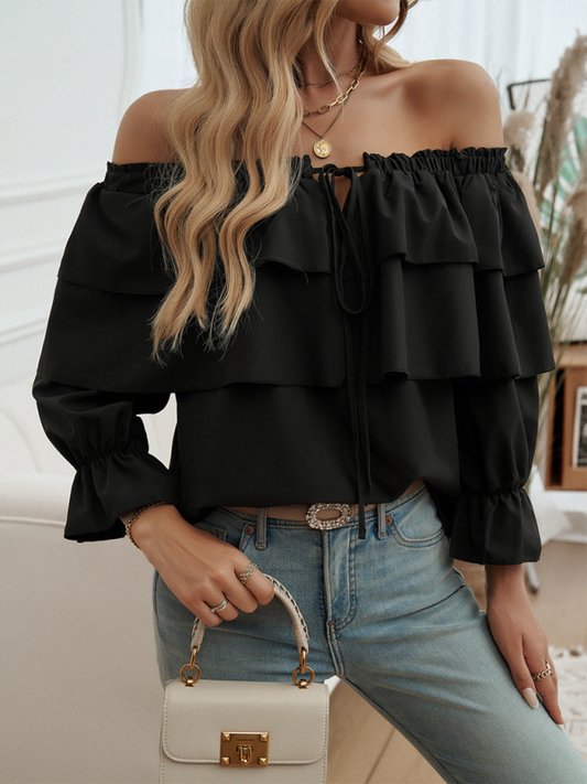Loose-fitting pleated off-shoulder balloon sleeve top