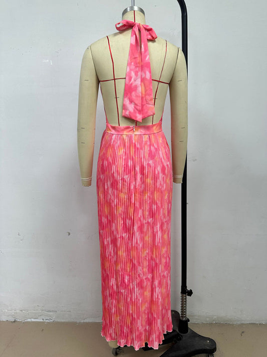 Sexy printed halter neck tie backless skirt slit long dress